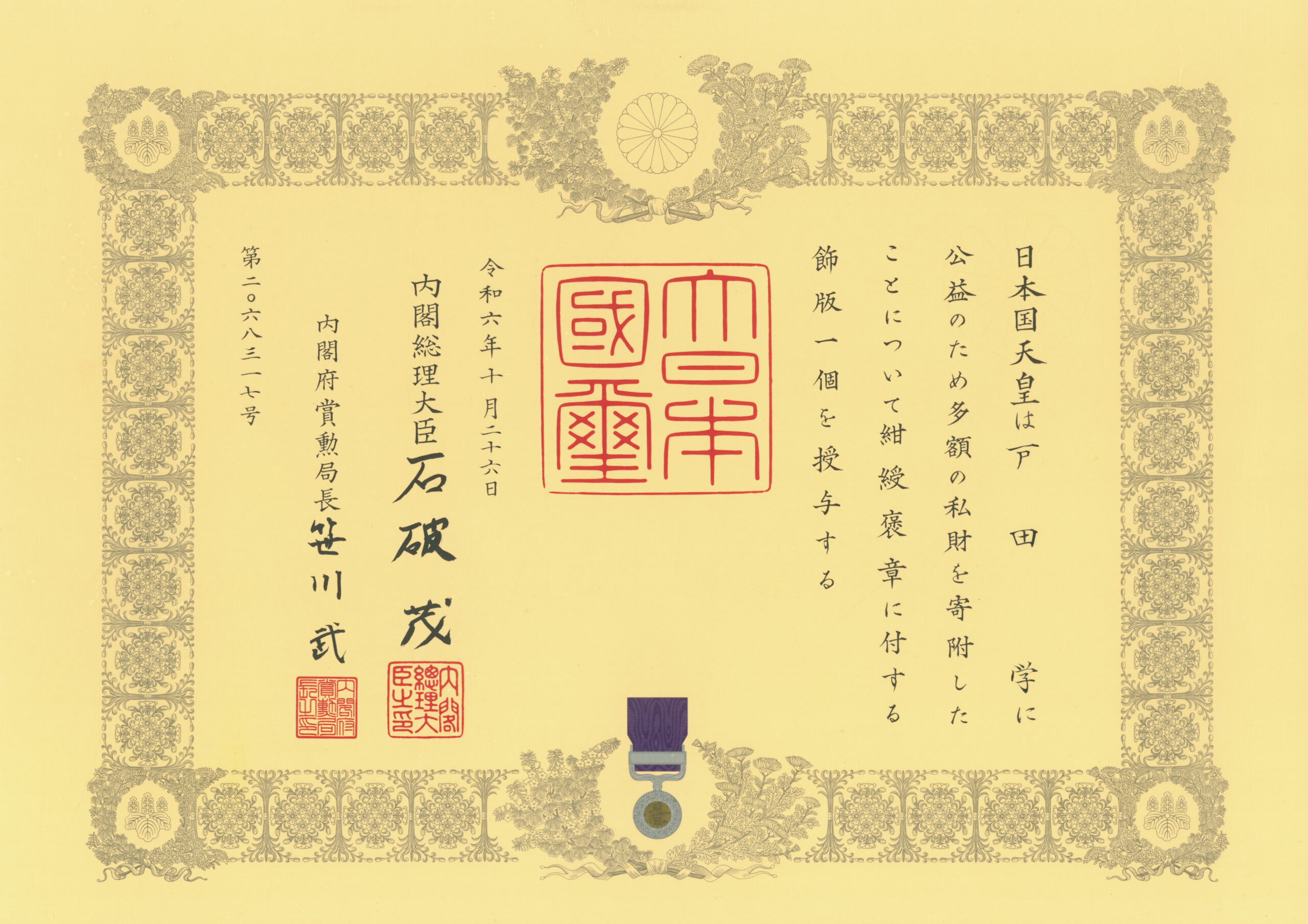 弊社代表 戸田学は、日本国天皇より公益のため多額の私財を寄附したことについて、紺綬褒章に付する飾版一個を授与されました。