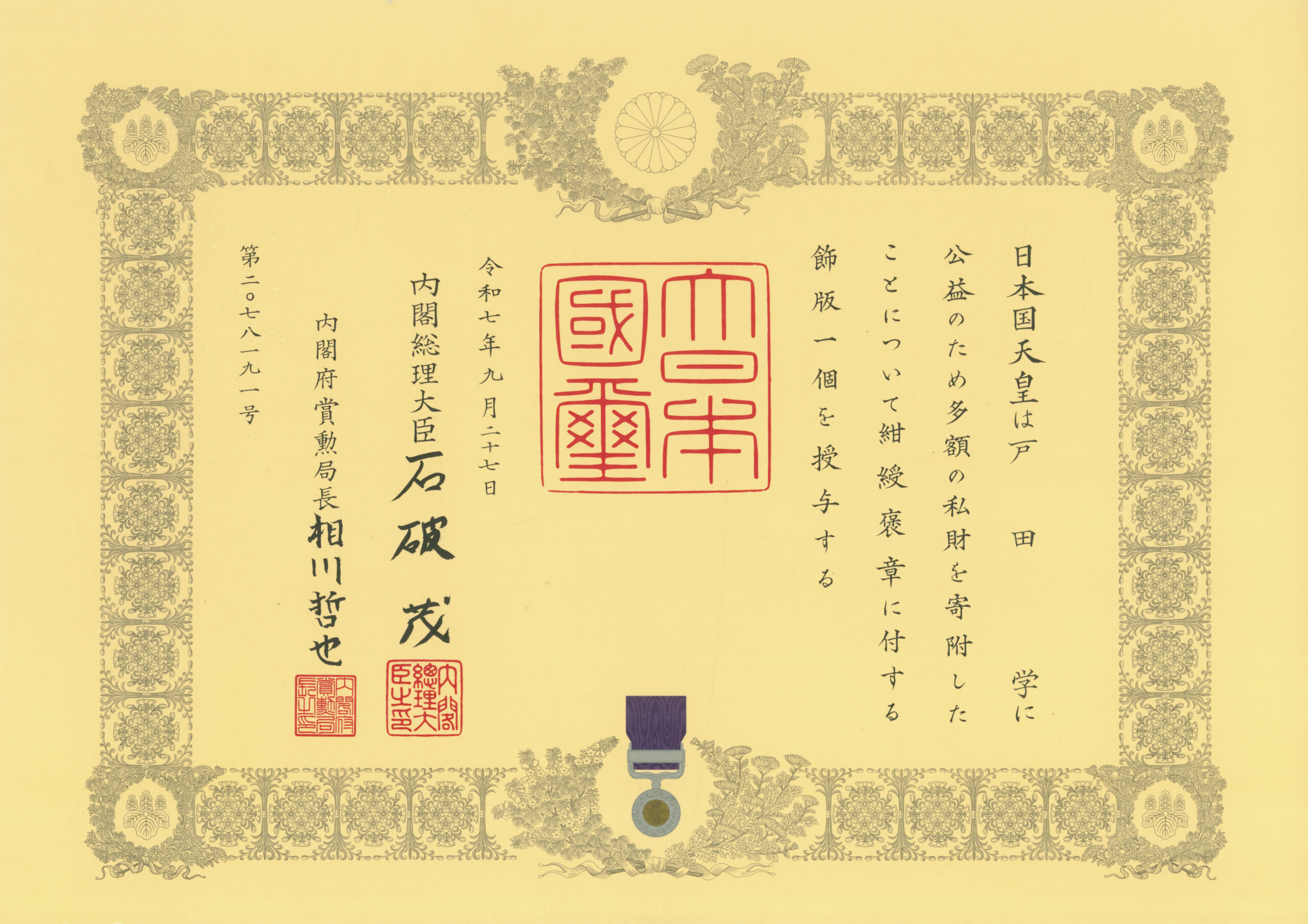 弊社代表 戸田学は、日本国天皇より公益のため多額の私財を寄附したことについて、紺綬褒章に付する飾版一個を授与されました。 書状並びに飾版は令和7年12月26日、静岡県庁に於いて鈴木康友知事から拝受いたしました。